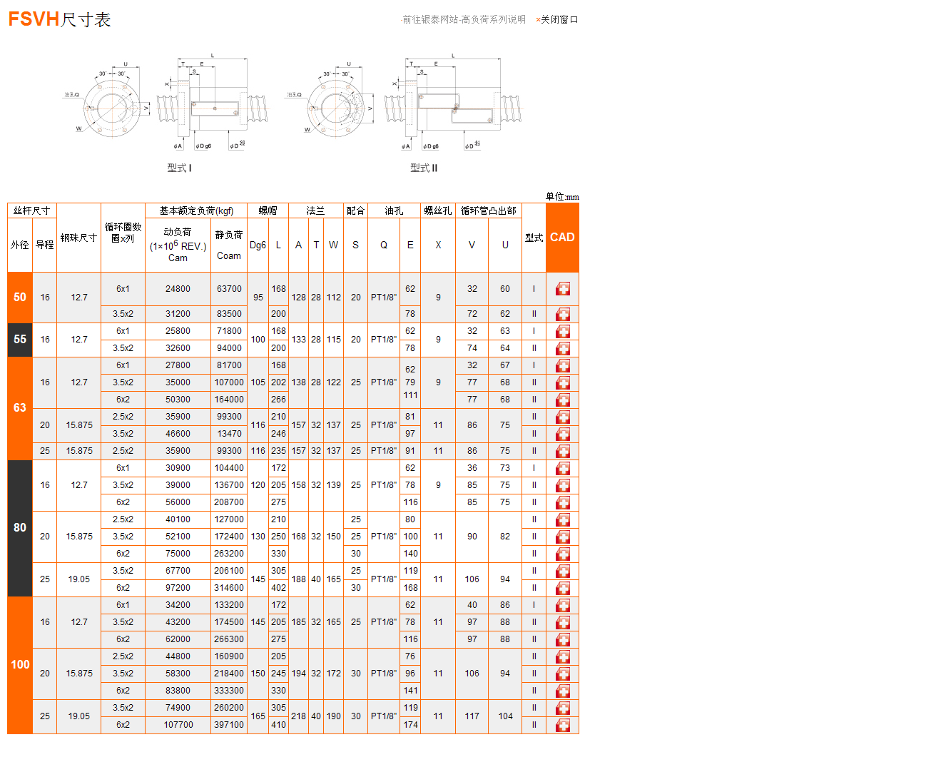 PMI 針對FSVH型式進行(鋼珠與螺紋的接觸角、鋼珠直徑、回流方式)的改善,提高與舊型式(FSVC)差異2倍以上之額定動負荷。(PMI滾珠絲桿詳細簡介)